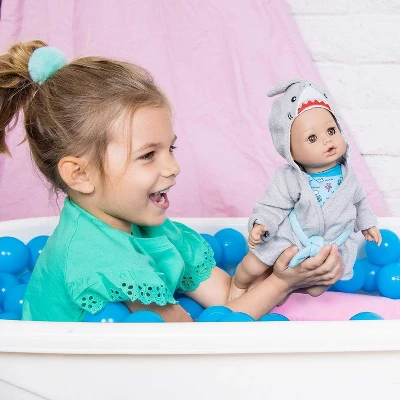 - FUN BATH BABY DOLL that comes with a gray shark-themed bathrobe detailed with cuffed sleeves and shark fin and face, and when taken off reveals his blue swimsuit body with cute shark prints