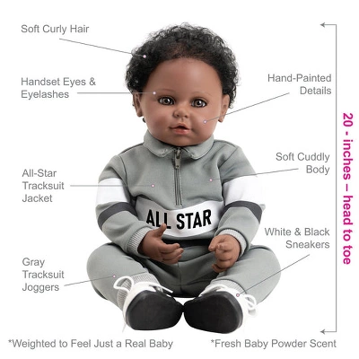 Size: 20″ Adora Doll Dark skin tone/Black hair/Brown eyes Hand-painted face Hand-applied eyelashes Hand-sewn premium quality fashions Made from our soft & silky CuddleMe vinyl ADORAble & Realistic baby doll face Weighted to feel just like a real baby Fresh baby powder scent Removable clothing Ages 6 and up Pumping in his stylish tracksuit co ords, feel the hype from Adora ToddlerTime Doll Touch Down! This toddler doll is tough and ready to join you in every adventure. And oh boy, he is definitely on beastmode in his modish gray half-zip tracksuit jacket with a print that reads BEAST MODE”, partnered with a gray track pants. Pulling this dapper street look, Touch Down wears his favorite white sneakers with black details as a finishing touch to his ADORAble ensemble Adora ToddlerTime Doll Touch Down is the perfect toddler doll for all ADORAble girls and boys! He has a dark skin tone, and soft curly black hair that perfectly highlights his beautiful brown eyes. This realistic toddler doll measures 20 inches from head to toe with a weighted cloth body, a movable head, and vinyl arms and legs crafted from our baby powder-scented premium quality Cuddle Me Vinyl which is soft siky, gentle and feels more like a real baby. This boy play doll is perfect for the little hands to snuggle and play with! Best part about him is he also comes with her own traditional diaper, helps develop social skills while engaging in nurturing, pretend play! Made for play and an ideal gift for ages 6 and up. Browse Adora ToddlerTime Collection for more ADORAble lifelike toddler dolls and our PlayDate Accessories for a more realistic fun play in your nursery!