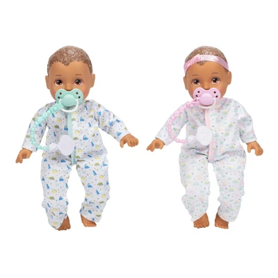 - Each twin comes with a matching milk bottle, pacifier, and pacifier clip